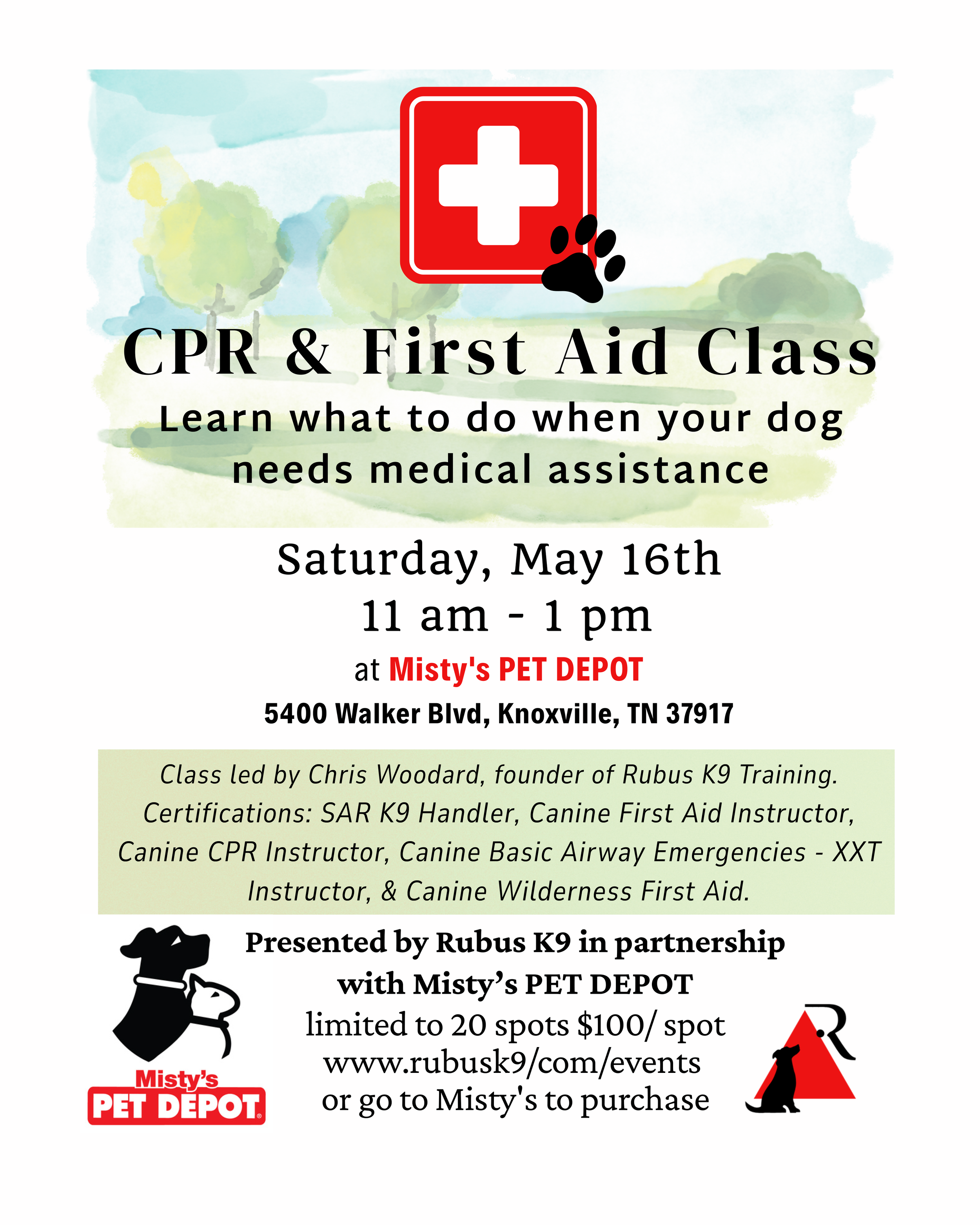 Classes are taught by Chris Woodard who is certified as: K9 Search and Rescue Handler, K9 First Aid Instructor, K9 Wilderness First Aid Provider, K9 CPR provider, and K9 Airway Emergencies- XXT. Chris is an experienced working dog handler, dog sport competitor and decoy, and a pet dog trainer. Learn form someone who has run dogs in disaster zones and kept them fit and healthy, and applies those lessons to sporting, working, and companion dogs and the situations they find themselves in.